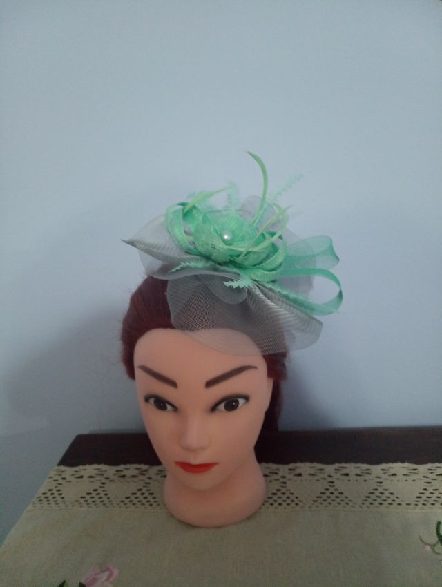 Tocado en tono verde agua y gris claro. puede sujetarse con diadema.
