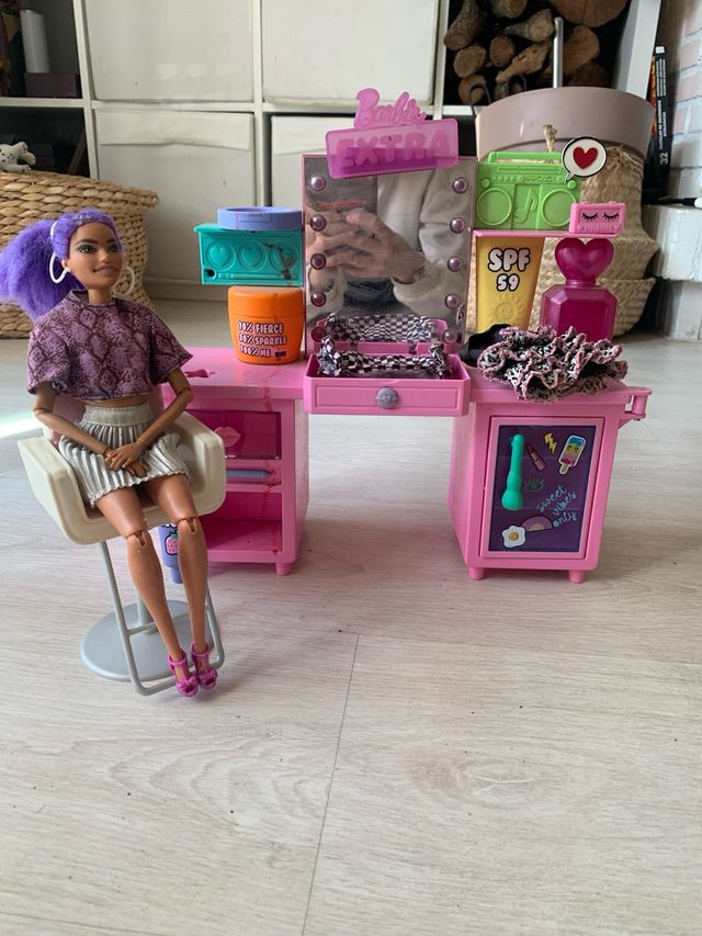 Detalles del productoSet de tocador Barbie Extra con muñeca incluida. Ideal para recrear momentos de moda y belleza.