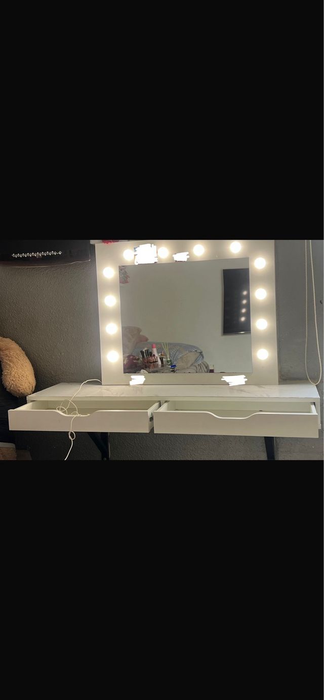 Tiene 3 tipos de luces, yo lo puse así en la pared pero tiene su mesa para ponerlo, lo entrego con el estante valorado en 50€ y la mesa de el tocador.