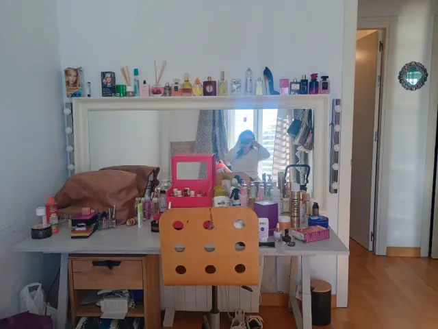 Detalles del productoTocador de maquillaje con espejo y luces.todo mesa espejo,luces y sillas de escritorio que se sube y se baja solo el escritorio me costó 300 euros
