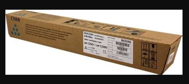 Detalles del productoCartucho de tóner original Ricoh 842046 de color cian con caja y un toner amarillo sin caja.