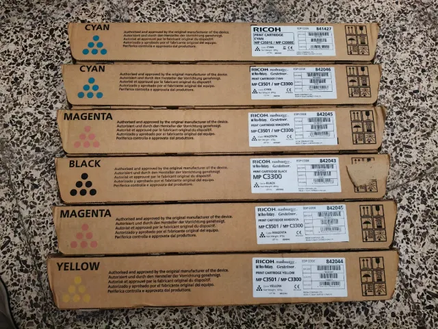 Lote de tóneres Ricoh para impresoras. - 2 tóneres Cyan - 2 tóneres Magenta - 1 tóner Negro - 1 tóner Amarillo - Modelos compatibles: MP C3501 / MP C3300