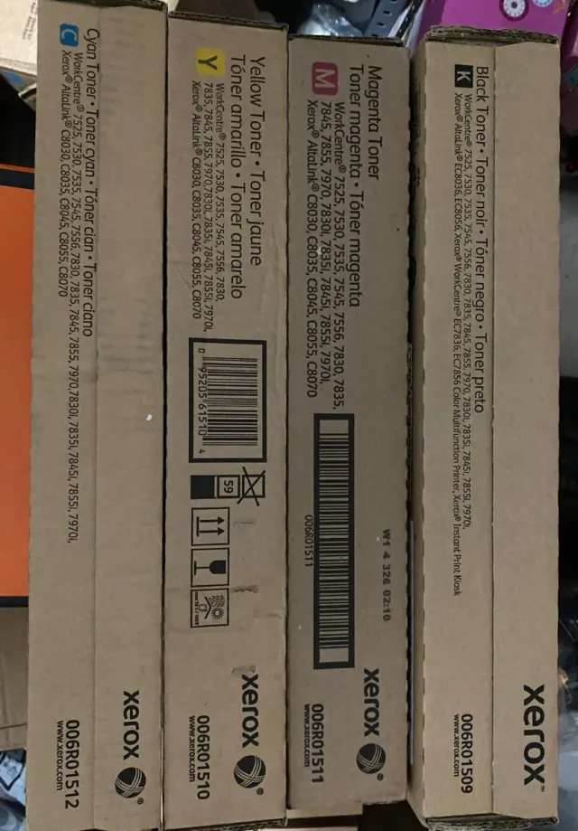 Se venden cuatro cartuchos de tóner Xerox, uno de cada color: azul, magenta, amarillo y negro.