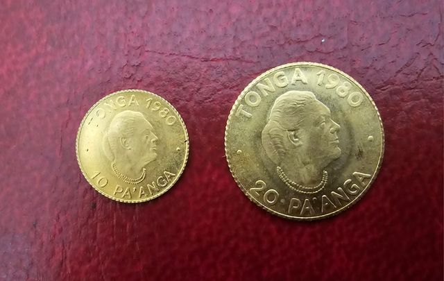 Monedas de oro de Tonga de 10 y 20 pa'anga del año 1980. 10 pa'anga: 0,4 g y 10 mm. 20 pa'anga: 0,8 y 14 mm. - Oro 917 mm. - Diseño conmemorativo.