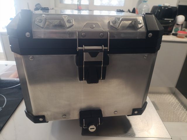 Top Case de aluminio para moto BMW, en buen estado. Algunos rasguños de uso. - Material: Aluminio. - Color: Plata. - Incluye cerradura.
