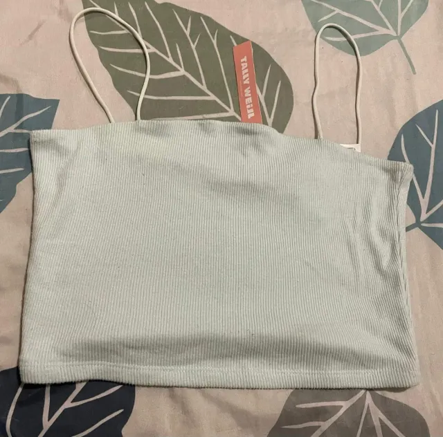 Top corto de tirantes con tejido de canalé. - Color: Azul claro - Marca: Tally Weijl - Diseño sin hombros