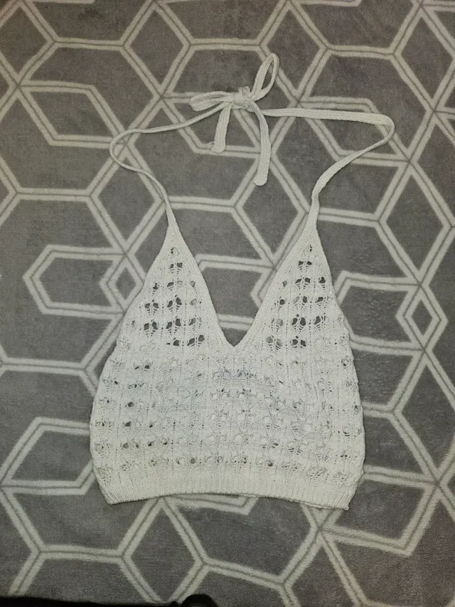 Top crop ganchillo blanco atado cuello Talla S