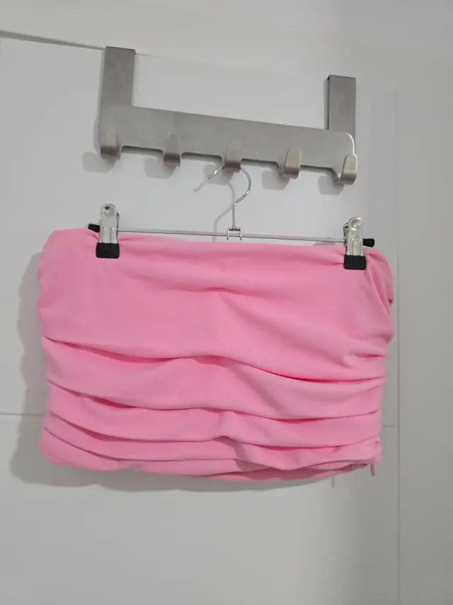 Top de banda rosa con un diseño fruncido y estructurado. Por dentro tiene como una estructura de corsé que hace muy buena figura y que no se baje el top. Rosa chicle muy mono, con cierre lateral de cremallera invisible. Literal me lo he puesto una vez porque tengo mucho pecho :( Se puede ver sin compromiso. Si te llevas varios artículos hago rebajas, echa un vistazo a mi perfil!