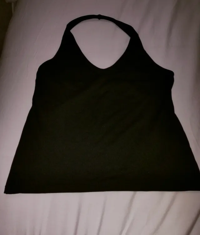 Este top negro tiene un diseño halter. - Escote pronunciado en V. - Tirantes que se anudan al cuello. Está sin utilizar.Talla M Es elástico
