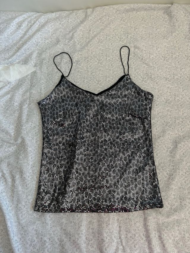 Top con lentejuelas brillantes en diseño zigzag. - Diseño de tirantes finos. - Escote en V. - Acabado metalizado.