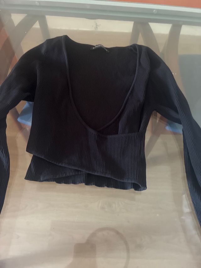 Top negro de manga larga con escote pronunciado. - Tejido acanalado. - Diseño cruzado. - Corte asimétrico.