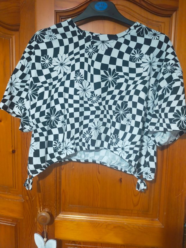 Detalles del productoPreciosa camiseta de niña, talla 12-13 años. Es de color blanco y negro, con estampado de cuadros vichy y flores. Tiene un diseño original y favorecedor.