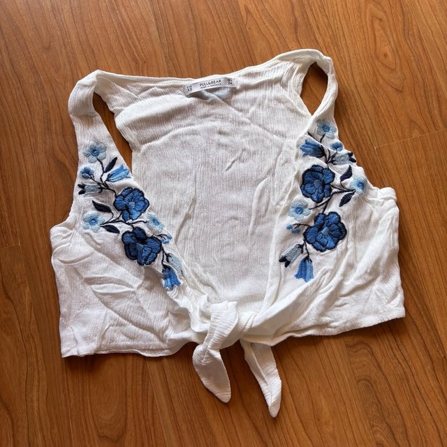 Top blanco de Pull&Bear con un bonito bordado floral en tonos azules. Tiene un diseño anudado en la parte delantera.