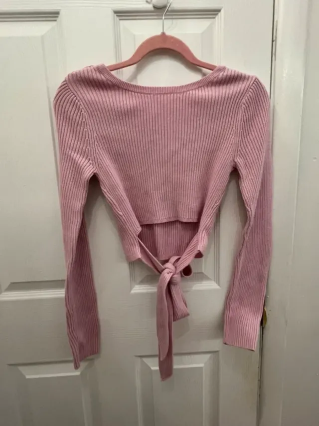 Este top de canalé en color rosa pálido es una prenda versátil y moderna. - Diseño de manga larga. - Detalle de lazo en la parte delantera. - Tejido acanalado.