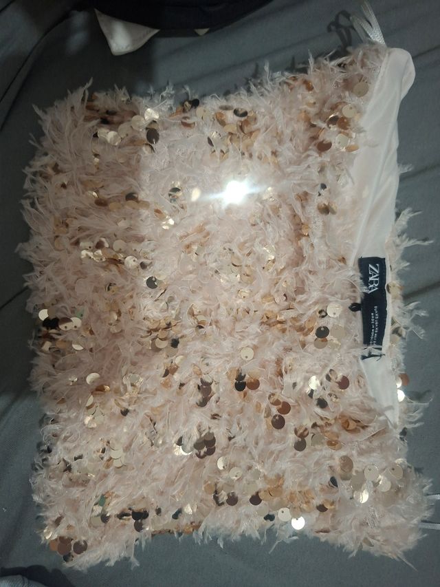 Top Zara lentejuelas y plumas rosa/dorado