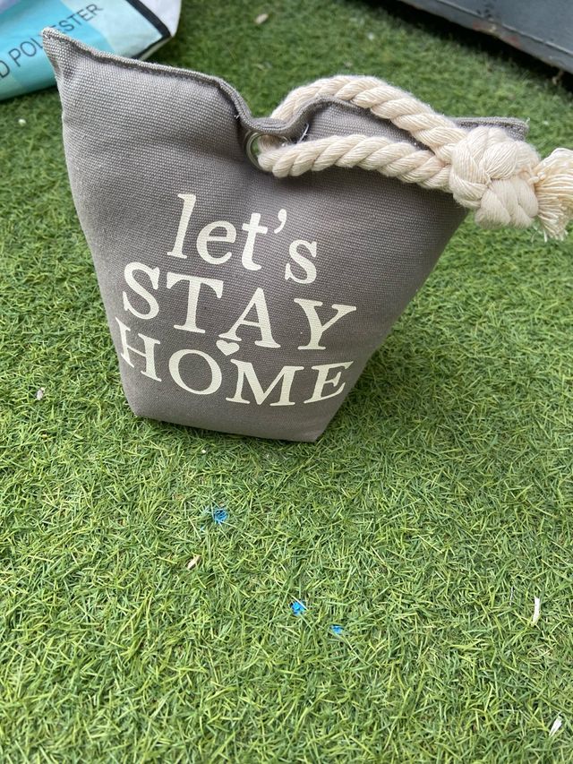 Original tope de puerta con mensaje. - Diseño en tela gris. - Mensaje Let's Stay Home en blanco. - Cuerda decorativa con nudo.