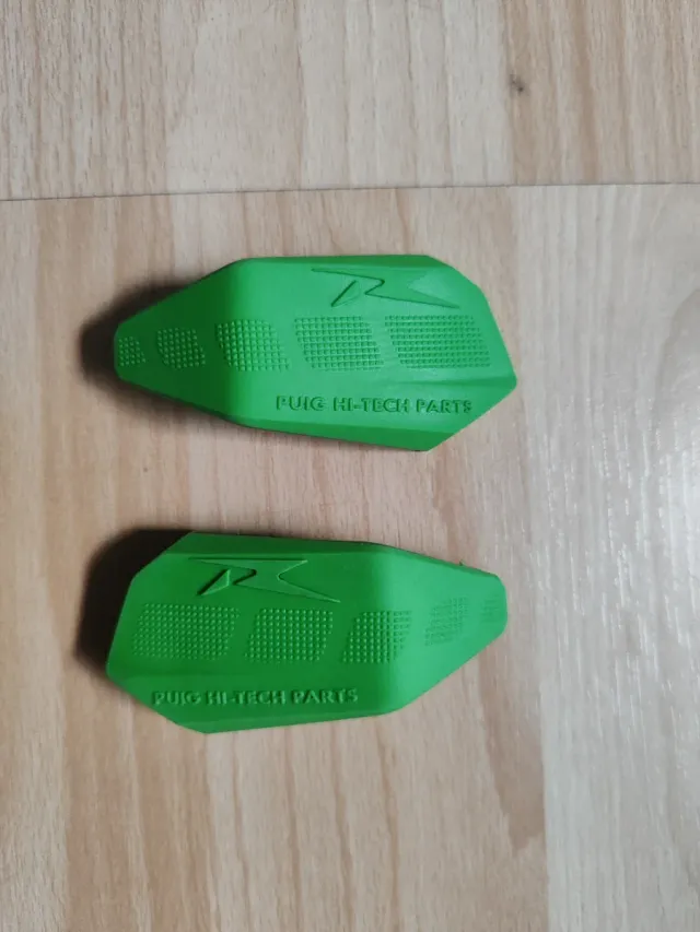 Set de topes anticaídas de la marca Puig, modelo Hi-Tech Parts. - Color verde brillante. - Diseño aerodinámico. - Logo de la marca grabado.