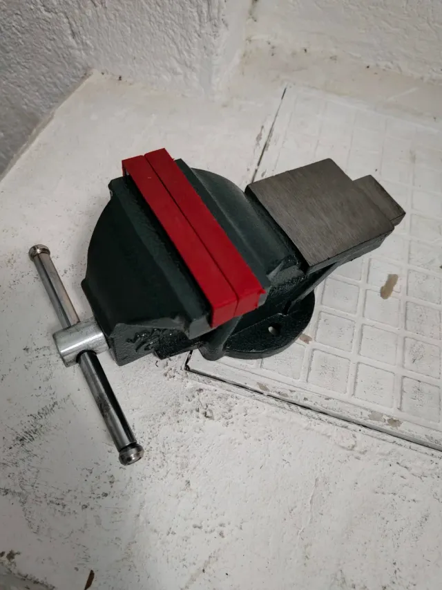Tornillo de banco robusto, ideal para trabajos de sujeción. - Mordazas con recubrimiento rojo. - Cuerpo principal de color negro.