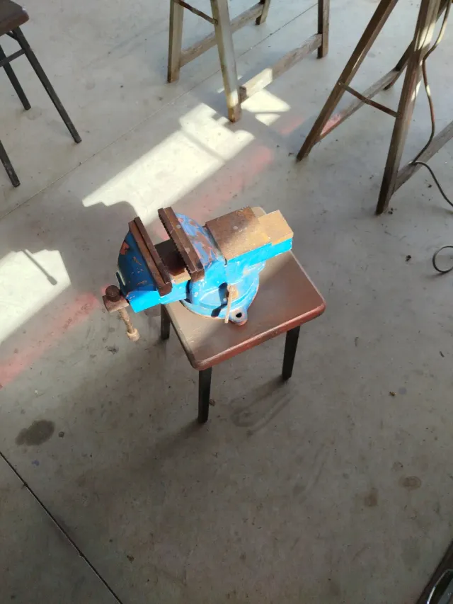 Tornillo de banco de color azul, ideal para trabajos de sujeción. - Cuerpo principal de color azul. - Mordazas de metal.