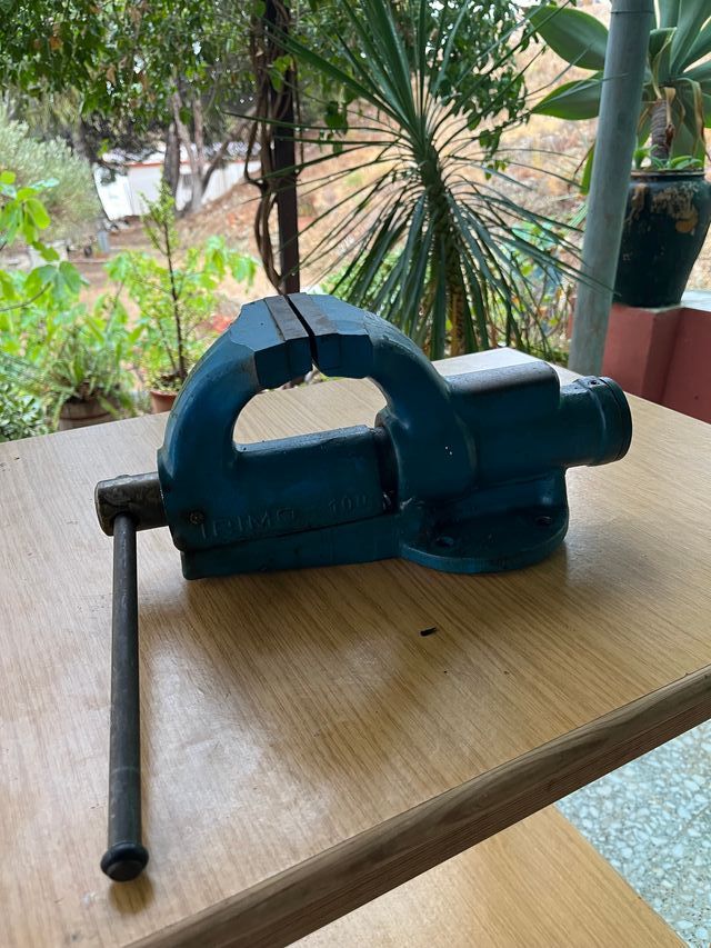 Tornillo de banco de color azul. - Marca: RIMO - Modelo: 100 - Cuerpo de metal resistente.