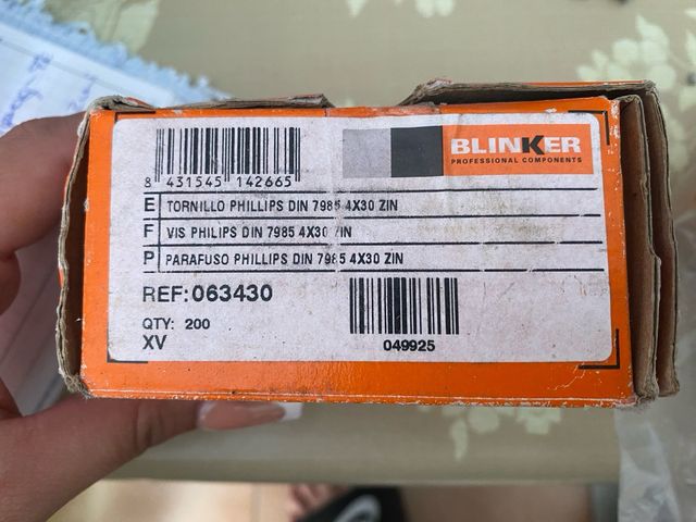 Caja de tornillos Phillips de la marca Blinker. - Modelo: DIN 7985 - Medida: 4x30 ZIN - Cantidad: 200 unidades - Referencia: 063430