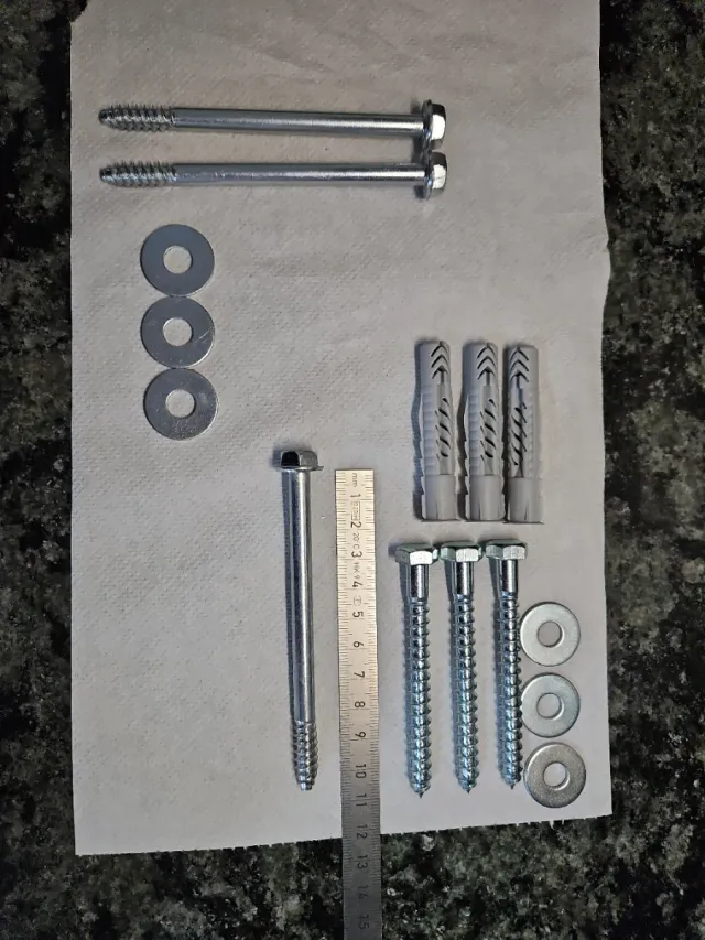 Detalles del productoLote de tornillos para tacos, también conocidos como tornillos barraqueros, junto con arandelas.