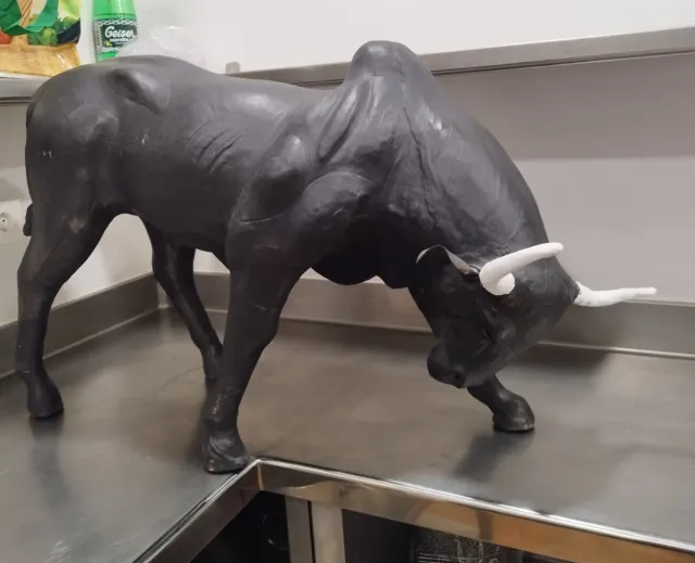 Figura decorativa de un toro negro, inspirada en el icónico Toro de Osborne. - Diseño detallado con cuernos blancos. - Material de acabado mate.