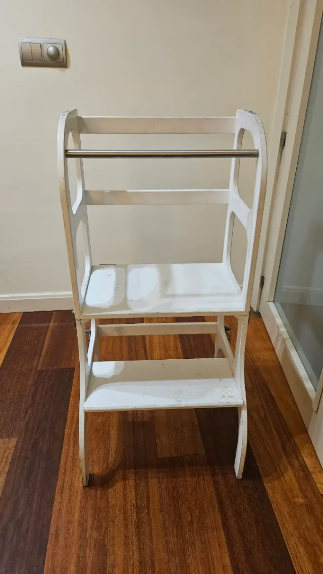 Torre de aprendizaje de madera, convertible en pupitre con asiento. Tiene marcas de pintura.