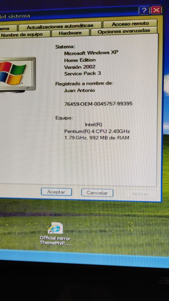 Detalles del productoSe vende torre de ordenador retro en buen estado. Incluye un PC con Windows XP Home Edition 2002, Service Pack 3. - Procesador Intel Pentium 4 CPU 2.40GHz a 1.79 GHz. - 992 MB de RAM. - Dispone de lector de CD. - Presenta un diseño elegante en tonos beige y morado.