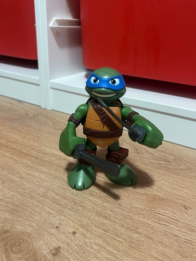 Figura de acción de una tortuga ninja articulada. - Personaje verde con antifaz azul. - Incluye dos espadas. - Brazos, piernas y cabeza articulados.