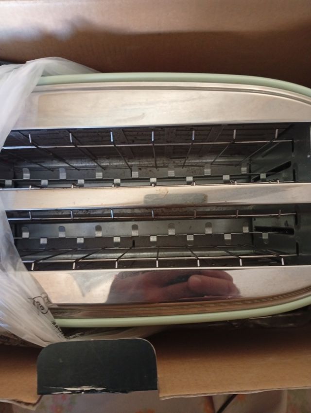 Tostador Cecotec en perfecto estado. - Diseño vintage en color verde menta. - Material de acero inoxidable. - Ranuras para dos rebanadas de pan.
