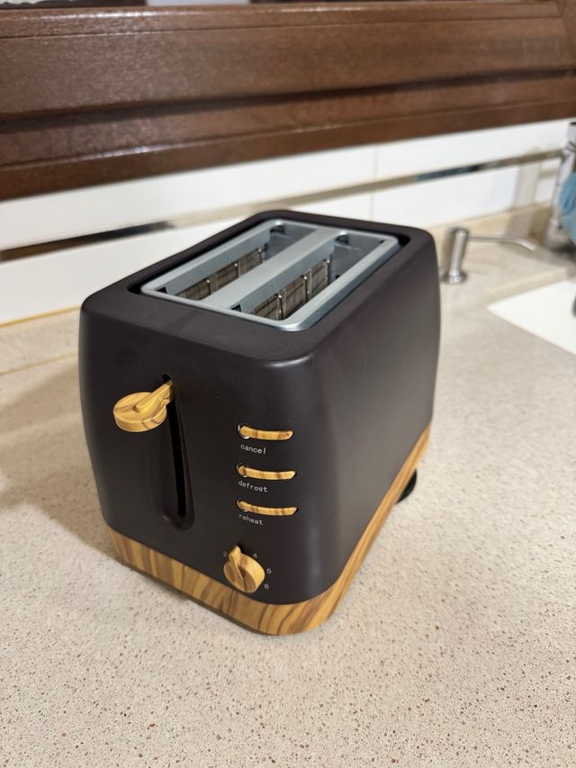 Detalles del productoTostadora con un diseño moderno y elegante, combinando un acabado negro mate con detalles en madera.
