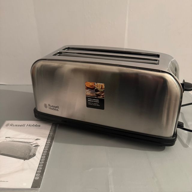 Detalles del productoTostadora Russell Hobbs Adventure 23610-56 con 2 ranuras largas y anchas para 4 rebanadas, fabricada en acero inoxidable en color plata. Usado – Como nuevo, sin uso real y en perfecto estado; presenta una pequeña abolladura que no afecta al funcionamiento (ver imágenes).