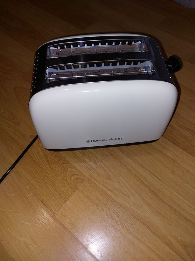 Tostadora Russell Hobbs de color crema en buen estado. - Diseño elegante y compacto. - Ranuras para dos rebanadas de pan. - Fácil de usar y limpiar.