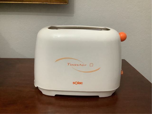 Tostadora eléctrica marca Solac, color blanco con detalles en naranja.