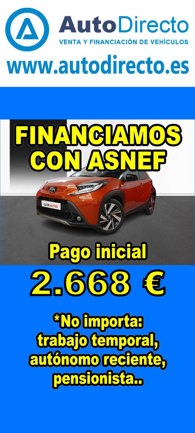 Detalles del producto¿No consigues financiación? ¡Tenemos la solución! *************************************************************************** RENT CREDIT: Aprobamos más del 90% de las operaciones. No importa ASNEF o RAI, impagos pendientes, ser autónomo o empresa reciente, ser pensionista. Imprescindible pago inicial del 20%. Ejemplo de operación: TOYOTA AYGO X CROSS 1.0 72CV TRENDY. Ref. W951079MBY - Precio vehículo financiado: 13340 €. - Pago inicial de 2668 €. - Cuota mes desde 282 €. - Impuesto de circulación y garantía (mínimo 1 año) incluidos. *************************************************************************** ✅ Más de 3.000 COCHES Y FURGONETAS EN STOCK. ✅ HASTA 2 AÑOS DE GARANTIA. ✅ Kilómetros certificados. ✅ 17 concesionarios repartidos en toda España. ♻️ Aceptamos tu coche como parte del pago. *************************************************************************** IMPORTANTE: -. Este anuncio, no es vinculante, puede contener errores. SE MUESTRAN A TÍTULO INFORMATIVO Y NO CONTRACTUAL. -. Consultar disponibilidad del vehículo y datos exactos: fecha de matriculación, importes, etc,... *************************************************************************** Te ofrecemos distintas opciones: financiación, renting, alquiler con opción a compra, rent credit. En nuestro stock disponible encontraras: 3008 , qashqai , corolla , rav4 , sandero , Duster , yaris , 2008 , Tucson , Ibiza , 208 , Sportage , a3 , c4 , Formentor , q3 , yaris cross , 500 , c3 , arona , zs , x1 , kona , corsa , clase a , león , 308 , serie 1 , golf , focus , captur , a1 , tiguan , i20 , t roc , stonic , xc40 , civic , q5 , serie 3 , glb , 5008 , ateca , clio , kuga , c hr , i30 , arkana , juke , a4 , x3 , cx 5 , xc60 , kamiq , taigo , Mustang , x6 , polo , ceed , karoq , x2 , Astra , niro , cx 30 , a5 , cooper , megane , moka , fiesta , hs , q2 , clase c , serie 3 , renegade , picanto.