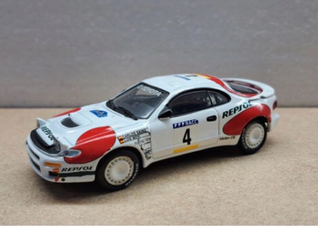 Réplica de coche de rally Toyota Celica. Escala 1/24 - Diseño de competición. - Detalles de patrocinadores. - Color blanco con detalles rojos y azules.