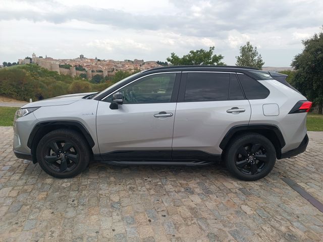 RAV4 de 218 cv, motor atmosferico de 2.5 l, hibrido gasolina, acabado Feel. Con elementos poco comunes como el techo solar panoramico y las estriberas a ambos lados (muy util si sube alguna persona mayor). Color plateado con carroceria bitono negro. Esta muy equipado. Tapiceria cuero negro y tela, diferentes modos de conduccion (sport, normal y eco) , con cambio de levas en el volante, llantas negro brillante de 18", camara trasera, sensores de aparcamiento, asientos delanteros electricos calefactados, cargador de movil inalambrico, bluetooth, espejos plegables electricos, faros full led, marcador digital, equipo sonido JBL 9 altavoces, asistente de velocidad de crucero con regulacion y limitacion de velocidad, asistencia de mantenimiento de carril, apertura y cierre sin llave, portón trasero electrico, antena aleta de tiburón, etc, etc...