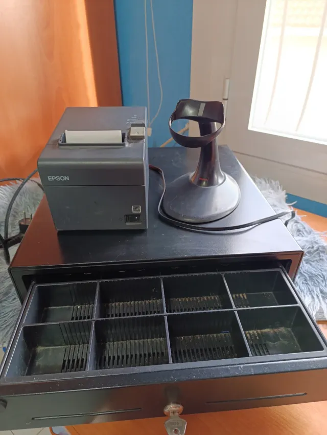 Detalles del productoCajón portamonedas para punto de venta eléctrico , más impresora de tickets Epson TMT 20 con puerto USB, más soporte para lector de código de barras.Medidas del cajón 41 por 41 .