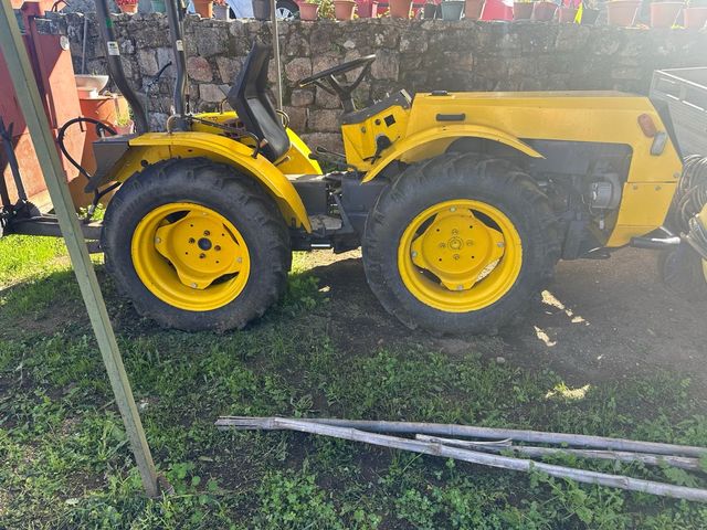 Tractor compacto de color amarillo. - Ruedas delanteras y traseras. - Asiento del conductor. - Volante.