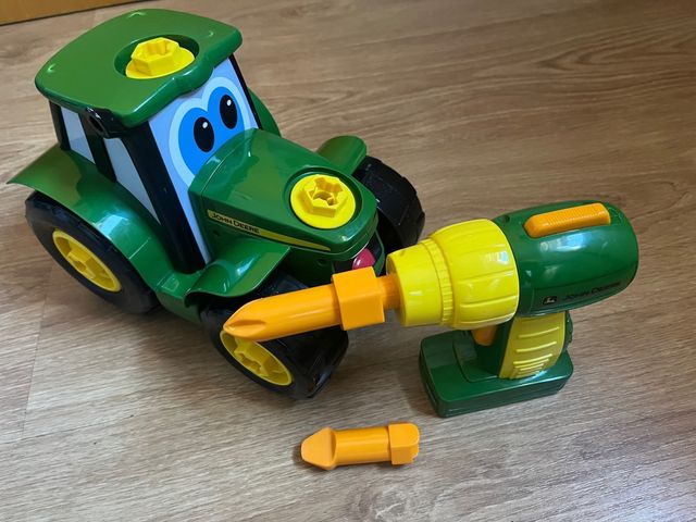 Tractor de juguete para niños John Deere que se monta y desmonta fácilmente gracias a su taladro eléctrico
