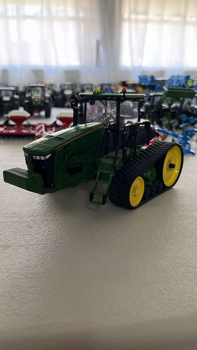 Detalles del productoRéplica detallada de un tractor John Deere con orugas y un cultivador.