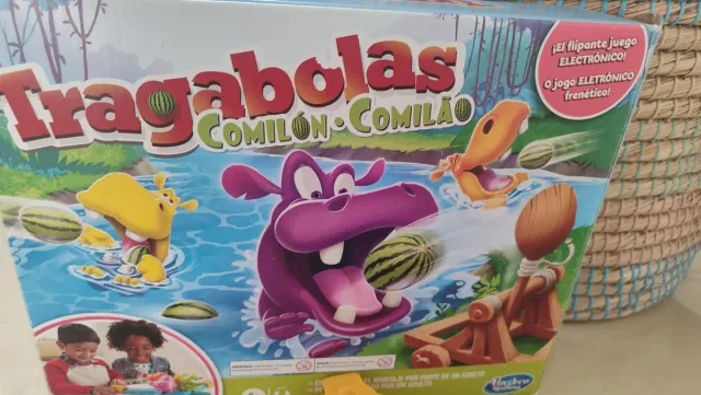 Detalles del productoCada jugador tiene 5 meloncitos de plástico en su catapulta. Apunta y lanza el melón antes que el hipopótamo cierre la boca de manera automática . Cómo nuevo, con caja e instrucciones.