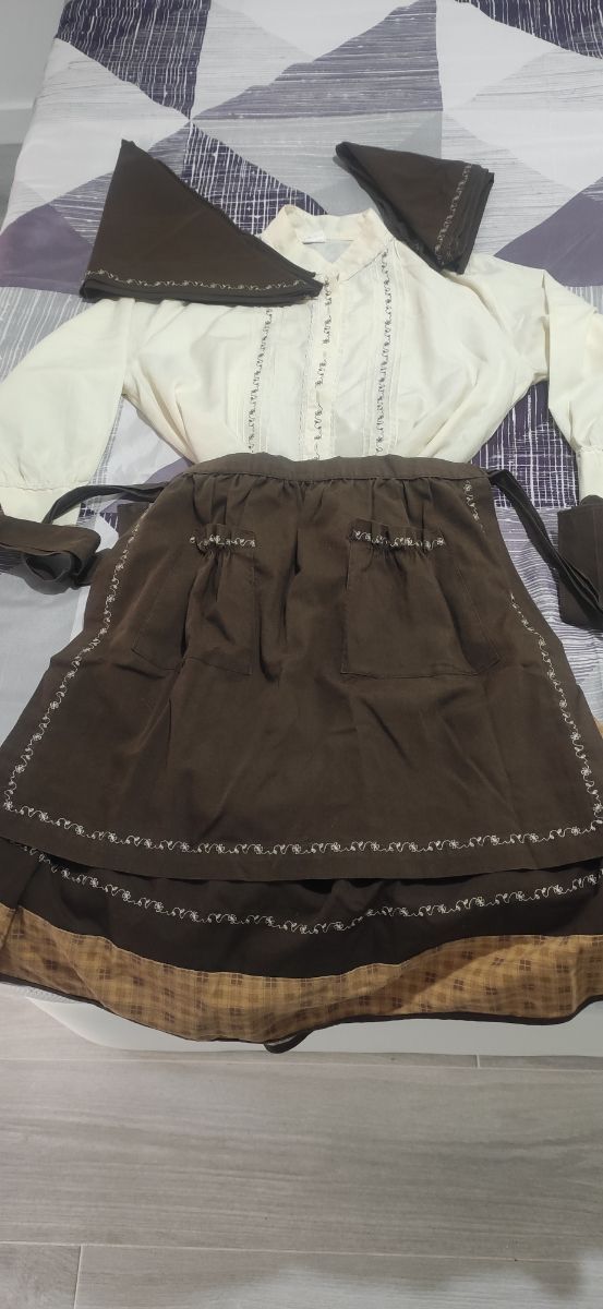 Traje de caserita para niña de entre 6 y 8 años. Compuesto por falda delantal camisa y dos pañuelos (hombros y cabeza).