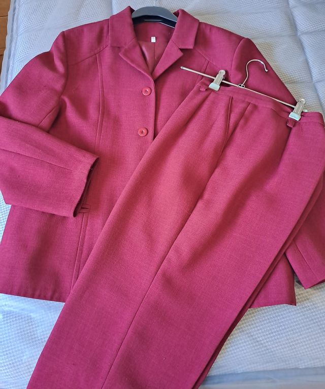 Traje chaqueta y pantalón rojo burdeos.