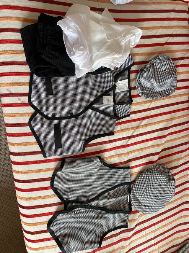 Detalles del productoConjunto chulapo para bebé, ideal para ocasiones especiales. Incluye dos chalecos 1 pantalón , 1 camisa , 1 gorro talla 1-2 años. y 1 chaleco - gorro de 4-6 años a juego y dos gorras. Los chalecos son de cuadros blancos y negros, con ribetes negros. Las gorras son del mismo tejido. Perfecto estado.