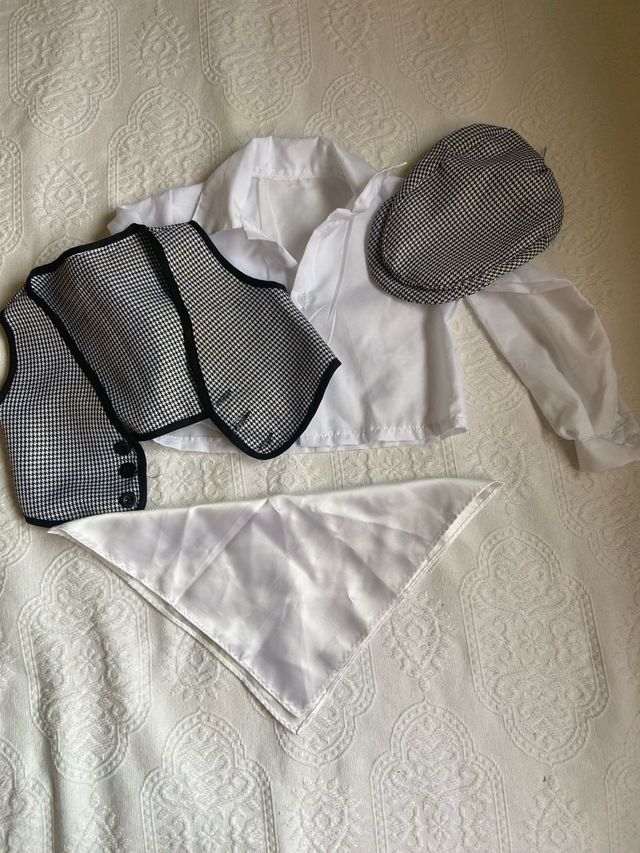 Conjunto de traje de chulapo para niño. Incluye camisa, chaleco, pañuelo y gorra. - Camisa blanca. - Chaleco de cuadros. - Gorra de cuadros. - Pañuelo blanco.