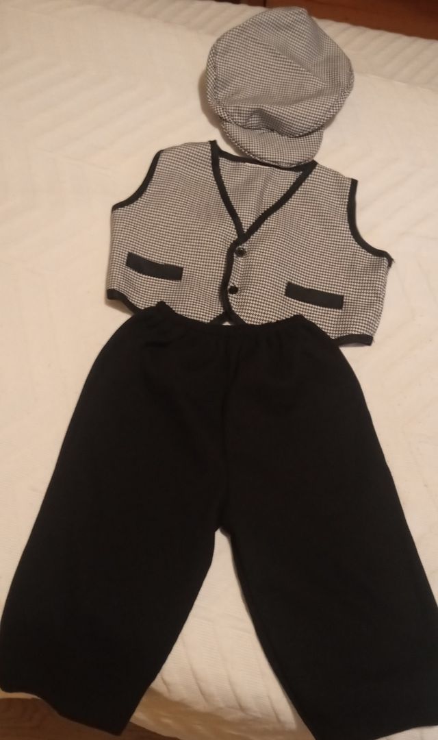 Detalles del productoConjunto de chulapo para niño, ideal para las fiestas de San Isidro. Talla 0-6 meses según la etiqueta, pero creo que se puede aprovechar hasta los 86 cm (a mi hijo le sirvió con esa medida). Contiene: