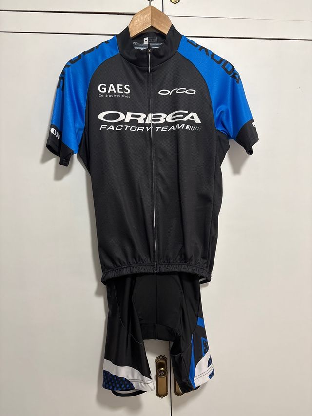Conjunto de ciclismo Orbea Factory Team. - Maillot negro y azul con logos. - Culotte negro con detalles azules y blancos. talla m