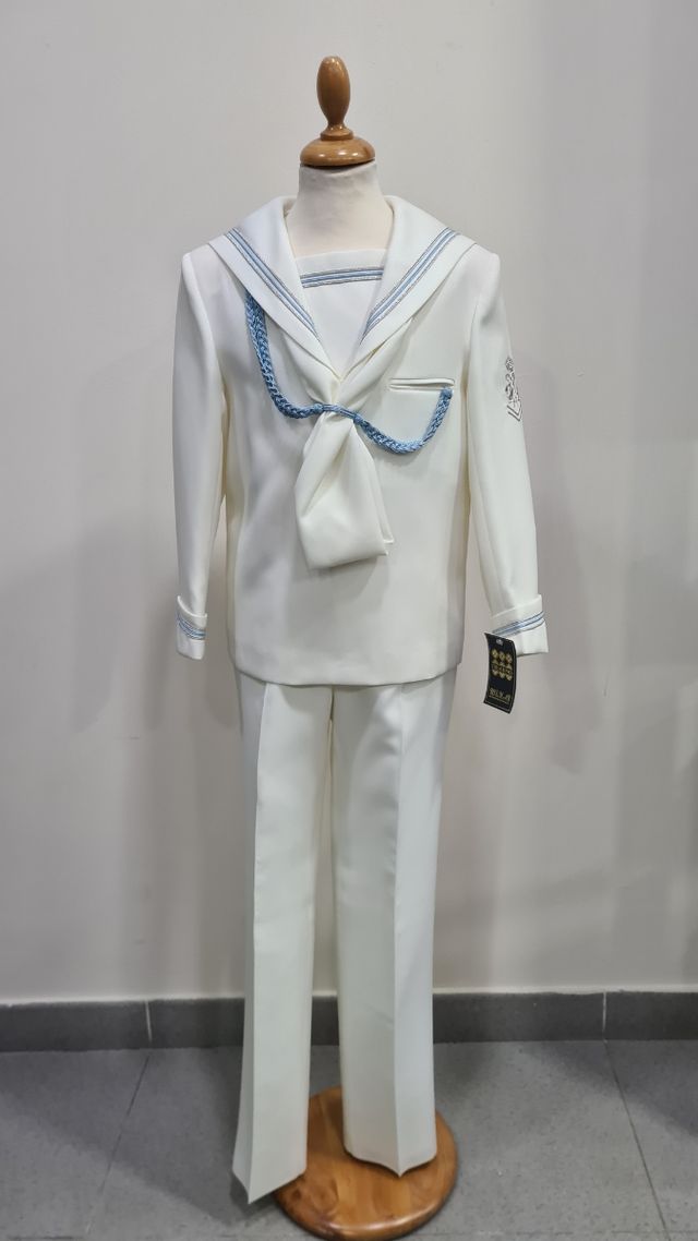 Detalles del productoTraje de comunion marinero de niño en color crudo con detalles en azul celeste y plata. El traje es nuevo procedente de liquidación por cierre de tienda (aun con su etiqueta). Disponibles talla 8 y 10.